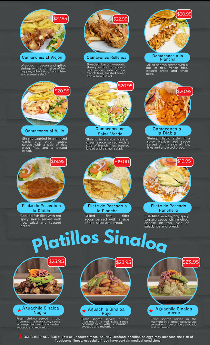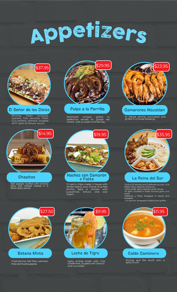 The menu boasts an array of seafood delights, showcasing authentic Sinaloan flavors. Notable highlights include the Molcajete Azteca, a hearty mix of skirt steak, chicken, and sausage, artfully accompanied by grilled cactus and stuffed yellow banana peppers. The Mariscada is a must-try stew brimming with fish, octopus, shrimp, and crab legs in a rich red salsa.
